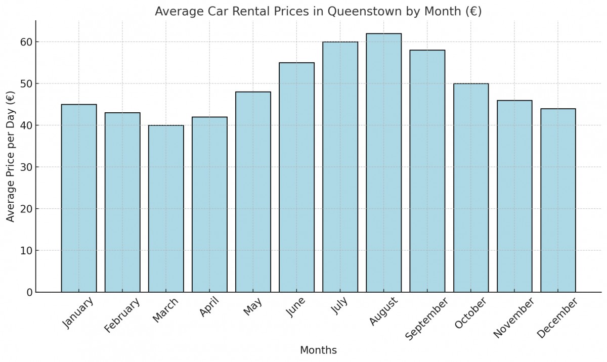 Automašīnu nomas cenas Kveenstaunā var ievērojami atšķirties atkarībā no sezonas. Šeit ir vispārīga apkopojums par vidējajām diennakts nomas cenām standarta automašīnai visu gadu garumā: