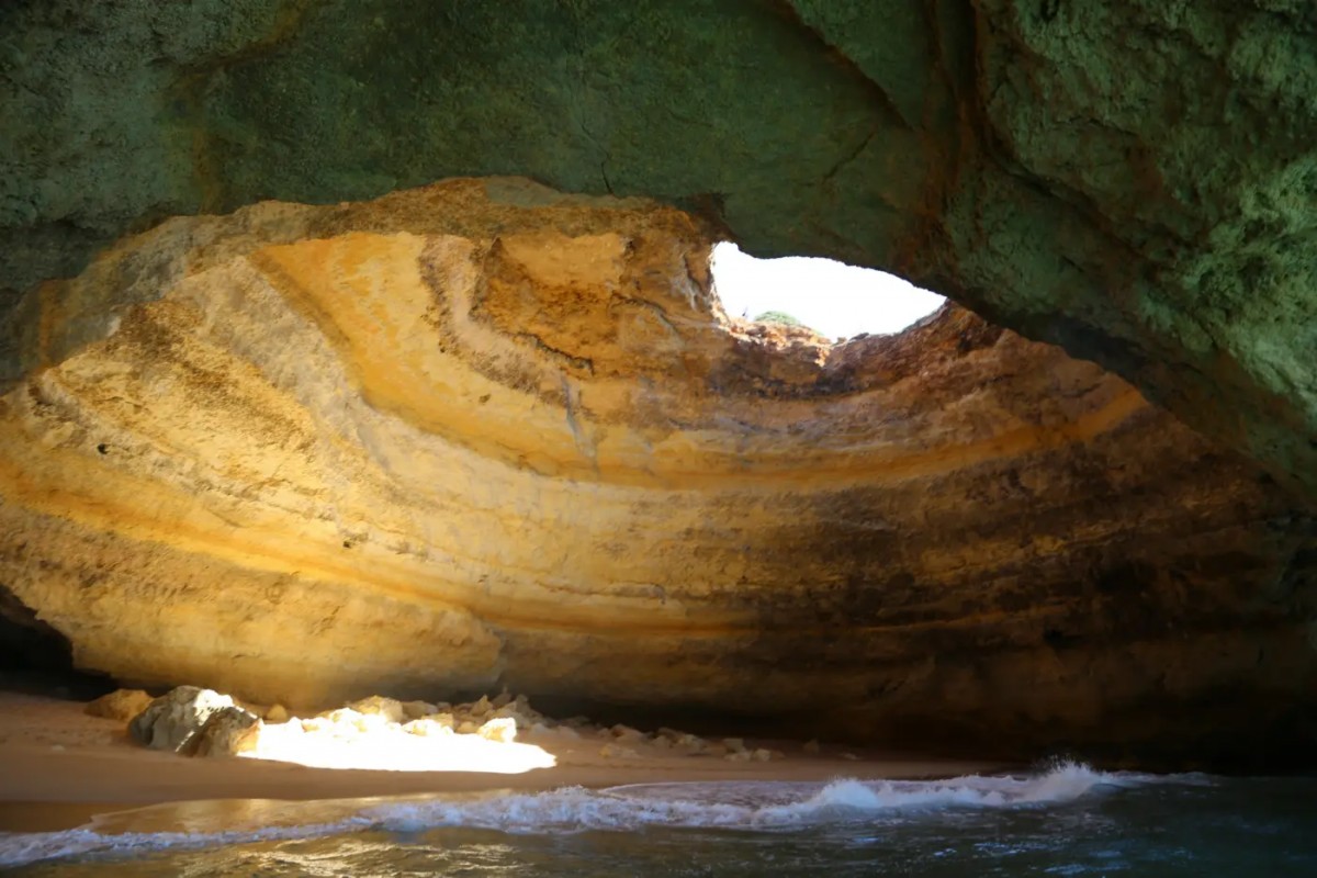 Ludzie mówią o Benagilu „jaskinia z tajną plażą” i to prawda, ale jest też trochę mylące, tak jak pocztówki. W środku jest fragment piasku, tak — blady owal pod okrągłym świetlikiem. Gdy pada na niego słońce, piasek wygląda jakby świecił od środka, jak odwrócona lampka. Ściany to miodowy wapień, pociągnięty ciemniejszymi smugami jak pociągnięcia pędzla, które ktoś zapomniał rozetrzeć.